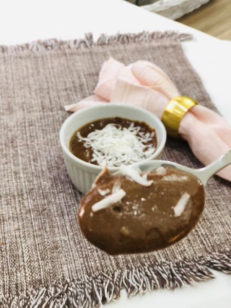 Prontinho! Coloquei em um refratário de vidro e decorei com o coco ralado por cima. Deixei na geladeira por algumas horas e aí, foi só aproveitar essa delícia!